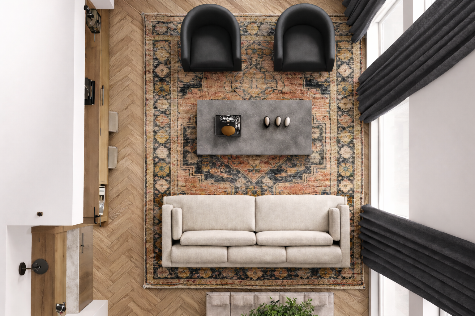 As you enter the home, the living room immediately establishes a sense of calm and connection. The seating arrangement places furniture facing one another to naturally encourage conversation, anchored by a vintage rug that introduces warmth and a subtle Moroccan influence.