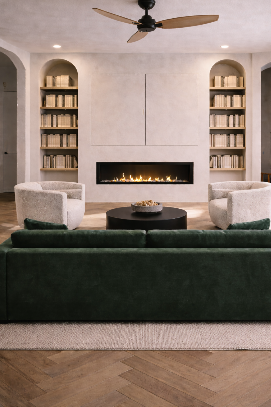 Designed as a continuation of the adjacent living room, the family room balances architectural presence with everyday comfort. A linear fireplace anchors the space, framed by custom arched niches and built-in shelving that introduce both symmetry and softness to the wall.